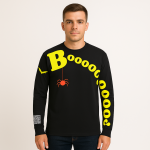 Give your wardrobe a frightfully fun twist with this Batman Inspired BOO! Long Sleeve With playful yellow typography, a hanging red spider, and a sneaky bat detail, this shirt screams spooky vibes — literally!